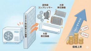 なぜかというと、新しい基準を満たすには高性能な部品が必要で、どうしてもコストがかかっちゃうから。業界では今のエアコンの約7割が生産終了かリニューアルになるとも言われてます。価格も3割以上高くなる可能性があるとか。