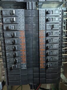 ちなみに、普通の分電盤だと子ブレーカーのところで100Vと200Vを切り替えられるんですが、今回のお家の分電盤は切り替え式じゃなくて、ブレーカー自体が100V用・200V用と分かれてるタイプでした。